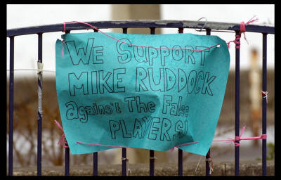 Sign on railings opposite White Rose, offering support for Mike Ruddock, the