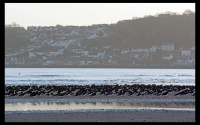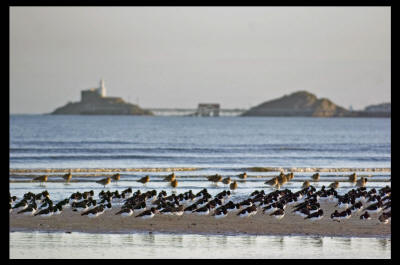 Seabirds on sandbank near Blackpill with Mumbles in the distance - 4.30pm
